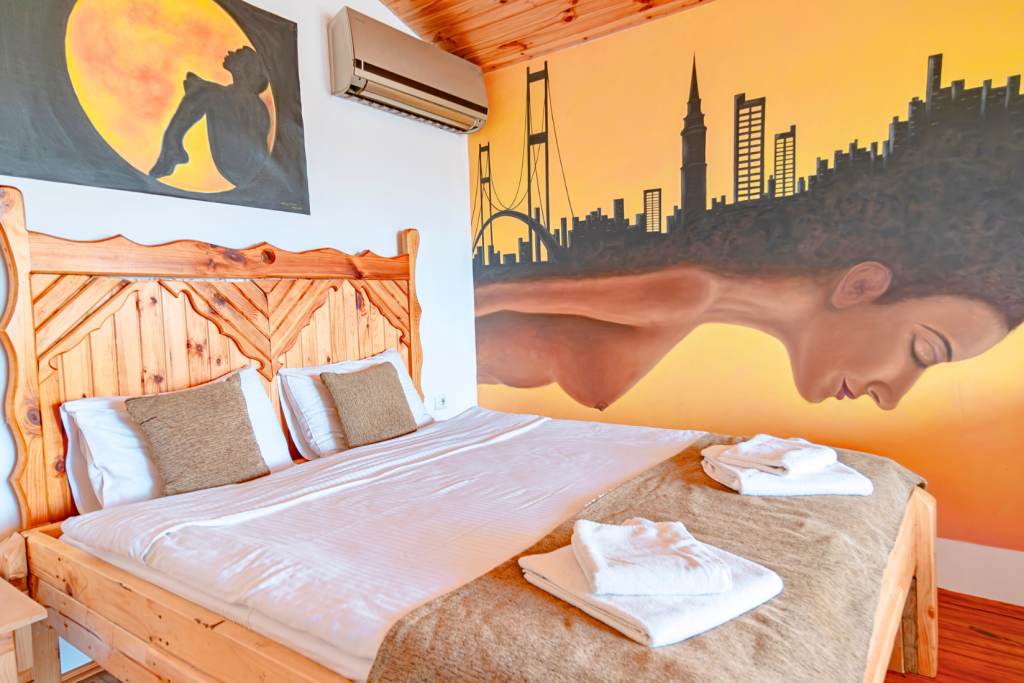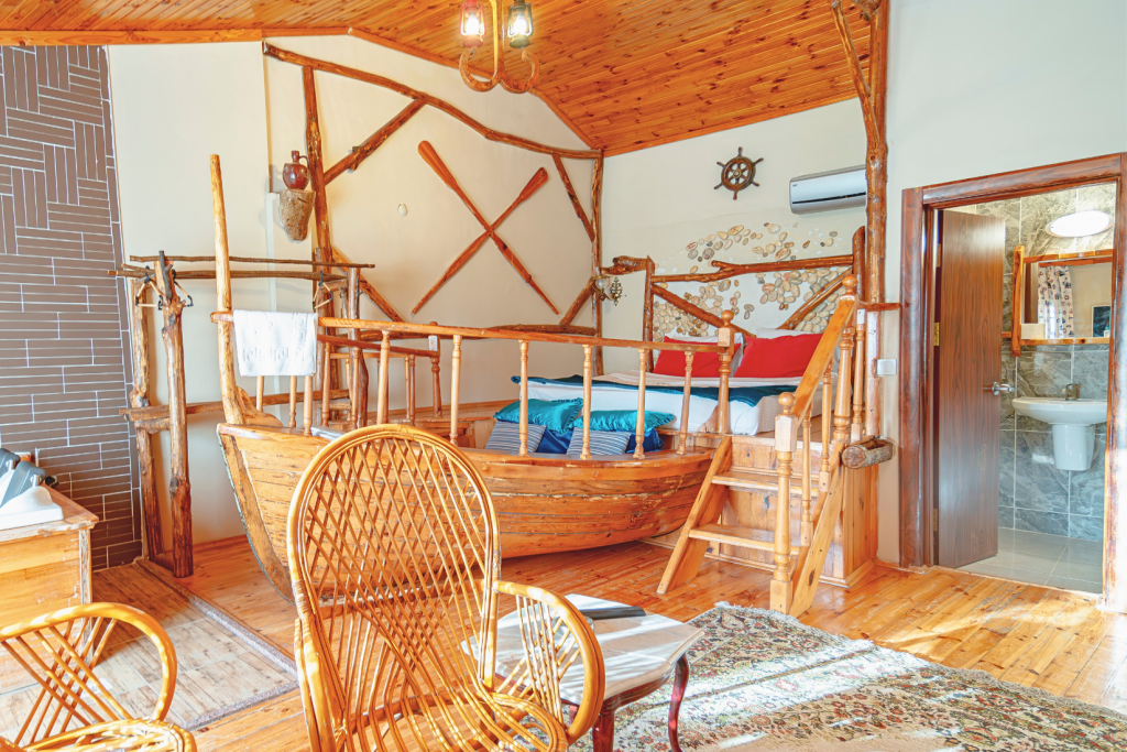 Ağva Masal Evi’nin en büyük ve etkileyici konaklama seçeneklerinden biri olan Masal 5 Şömine & Jakuzili Oda, büyüleyici nehir manzarası ve yüksek tavanlı ferah bir alanla sizi karşılıyor. Bu özel oda, sadece lüks ve konfor değil, aynı zamanda sandal şeklinde tasarlanmış eşsiz bir yatakla da dikkat çekiyor, size konaklamanız boyunca benzersiz bir deneyim sunuyor.